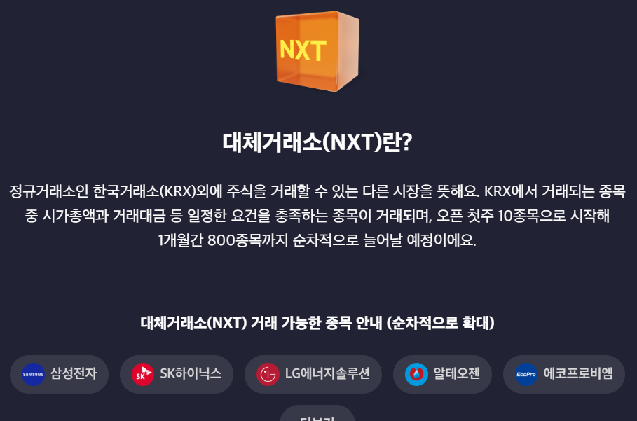 NXT 거래소는 한국거래소(KRX) 외에 새로운 대체거래소로, 투자자들에게 더 많은 선택지를 제공합니다.