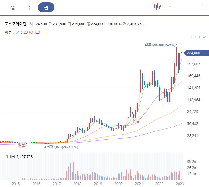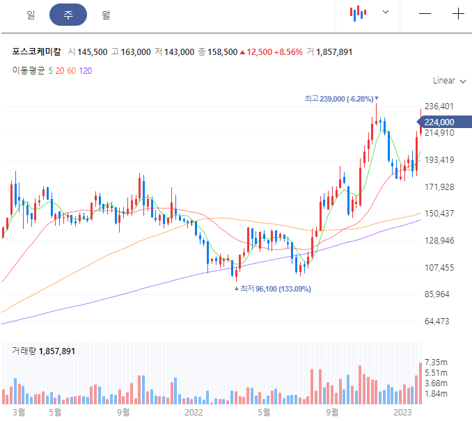 대규모 공급 계약 소식으로 최근 52주 신고가는 지난해 15일 기록한 23만 9000원으로 최근 주가 급등으로
