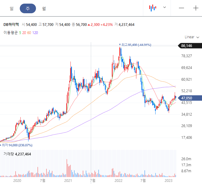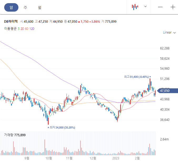 주봉 차트는 60일, 120일 선까지 다가가기에는 다소 시간이 필요해 보입니다.