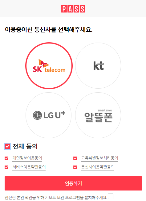 PASS가 나오고, 이용 중인 통신사를 선택하시고, 전체 동의를 클릭합니다.