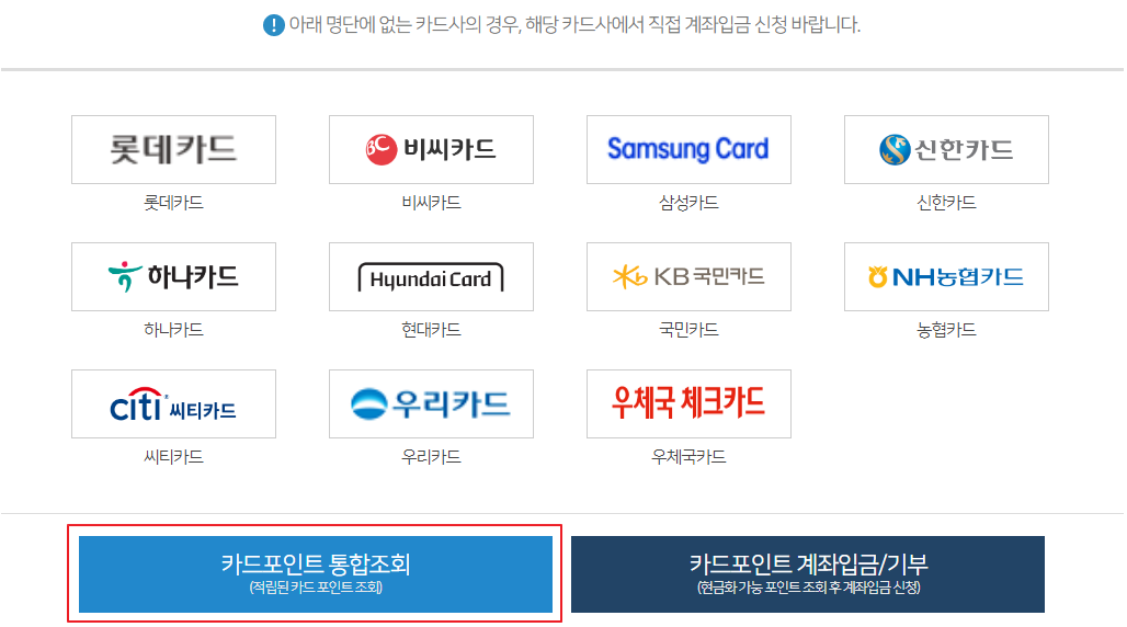왼쪽 하단의 카드 포인트 통합조회를 클릭합니다.